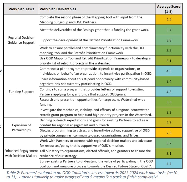 We started by considering the feedback from partners that was captured in the 2023 annual report. That report marked the midway point of the biennial workplan. This scoring criteria was based on the perception of whether we were expected to make progress or complete the task by the end of the 2023-2024 biennium. Partners scored the Coalition as most on track to finish tasks related to Funding Support, Enhanced Engagement with Decision Makers, and for most tasks under the Regional Decision Guidance Support. They scored the Coalition least likely to make progress on tasks related to Expansion of Partnerships. Overall, most tasks received an average score greater than 3 (out of 5), indicating a general perception amongst Partners that the Coalition is making progress on most tasks in the Workplan (Figure 1).