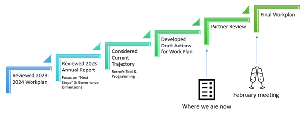 This draft was shared with Partners at our 11/19/2024 Partner meeting and attached to a meeting summary for comment by the end of the year. The new workplan puts a heavy emphasis on regional retrofit program development – including the finalizing of decision support tools, researching financing opportunities, connecting with other entities working towards common goals, and improving our process as a Coalition.