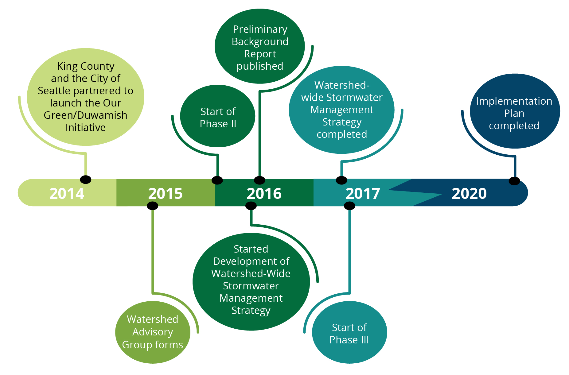 In September 2014, King County and the City of Seattle partnered to launch the Our Green/Duwamish (OGD) initiative to develop strategies to strengthen communities and improve air, land, and water conditions in the Green/Duwamish watershed (Watershed). This initiative is intended to increase coordination of current work in the watershed at the local, state, and federal levels to manage habitat restoration, salmon recovery, flood control, stormwater management, public health, social equity, environmental cleanups, economic development, open space preservation, water quality, and more.